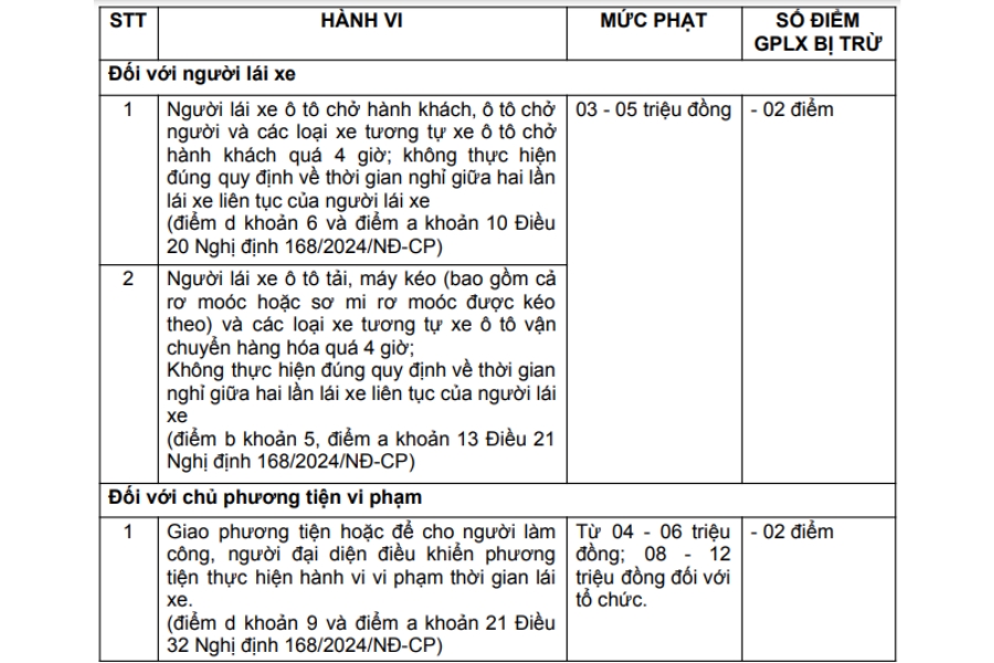 Chủ phương tiện có thể bị xử phạt nếu để tài xế lái xe liên tục quá 4 giờ. Dưới đây là bảng chi tiết mức phạt mà chủ phương tiện sẽ phải đối mặt: